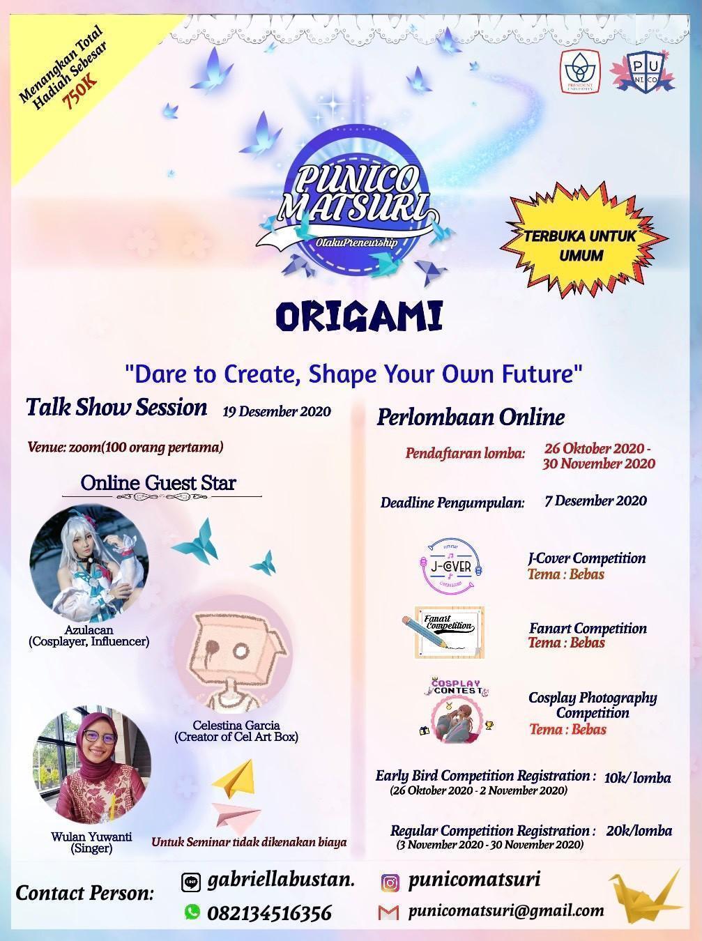 Dengan mengangkat tema “Origami: Dare to Create, Shape Your Own Future”, acara yang bertemakan budaya Jepang ini bertujuan untuk meningkatkan kesadaran pemuda/i tidak boleh menyerah untuk menjadi positif dan perlu beradaptasi untuk menjadi lebih baik lagi di era pandemi ini, baik dalam segi memperbaiki diri, berhobi, berinteraksi, maupun menggapai cita-cita demi masa depan yang lebih baik.