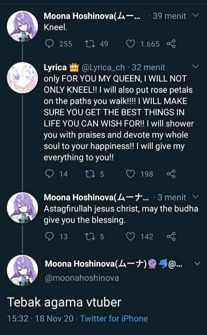 Beberapa hari ini, dunia internet Indonesia hangat membicarakan kontroversi virtual youtuber asal ahensi Hololive, yaitu Moona Hoshinova. Kali ini, guyonan yang bersangkutan mendapatkan reaksi negatif dari warganet karena bercanda dengan membawa agama.