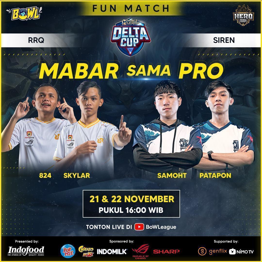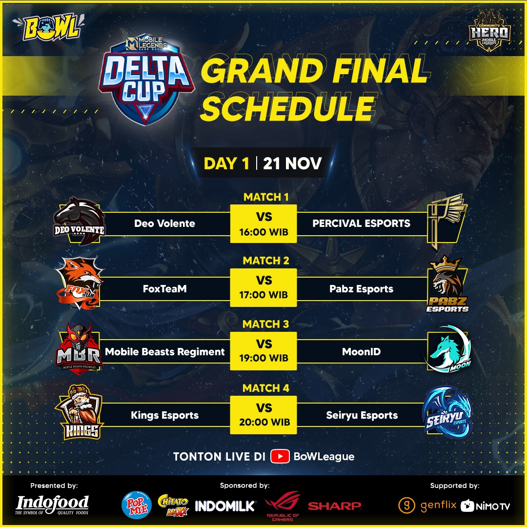 Sambut kehadiran generasi pro team Mobile Legends terbaru di babak final Delta Cup: Mobile Legends Bang-Bang yang diselenggarakan Battle of Warriors League (BoWL) weekend ini 21 – 22 November mulai pukul 16:00 WIB di kanal Youtube BoWL, Nimo TV dan Genflix. Momen yang dinanti pejuang babak qualifier untuk membuktikan kekuatan mereka melawan tim professional telah hadir. Mereka akan merebut total Prize Pool sebesar Rp20.000.000 + 75.000 Diamonds.