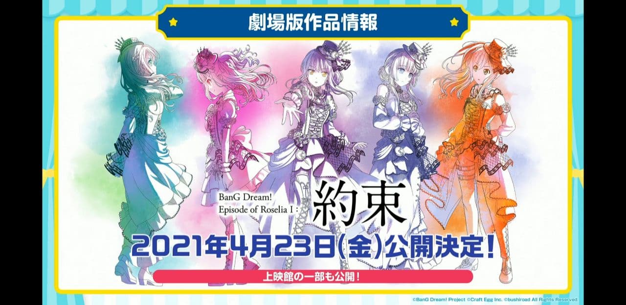 BanG Dream!, serial anime ini sebagaimana telah diberitakan sebelumnya akan hadir kembali dalam sebuah film layar lebar berjudul BanG Dream! FILM LIVE 2nd Stage. Masih belum ada informasi lebih lanjut kapan kiranya film layar lebar terbaru tersebut dirilis, selain informasi bahwa film ini masih dalam tahap pembuatan. Namun selain film tersebut, diumumkan juga akan adanya 3 buah film layar lebar baru yang akan dirilis di masa mendatang. Dari ketiga proyek film layar lebar terbaru tersebut, dua di antaranya akan berkisah mengenai grup Roselia. Dengan judul Episode of Roselia I: Yakusoku (Promise) dan Episode of Roselia II: Song I am., kedua film tentang Roselia tersebut rencananya akan dirilis di Jepang pada tahun 2021 mendatang, di mana film pertama yang berjudul Episode of Roselia I: Yakusoku (Promise) telah diumumkan akan dirilis di Jepang pada tanggal 23 April 2021 mendatang. Sementara satu film lagi masih akan berkisah mengenai Poppin’Party, yang akan berjudul Poppin’ Dream!, dan akan dirilis di Jepang pada tahun 2022 mendatang.
