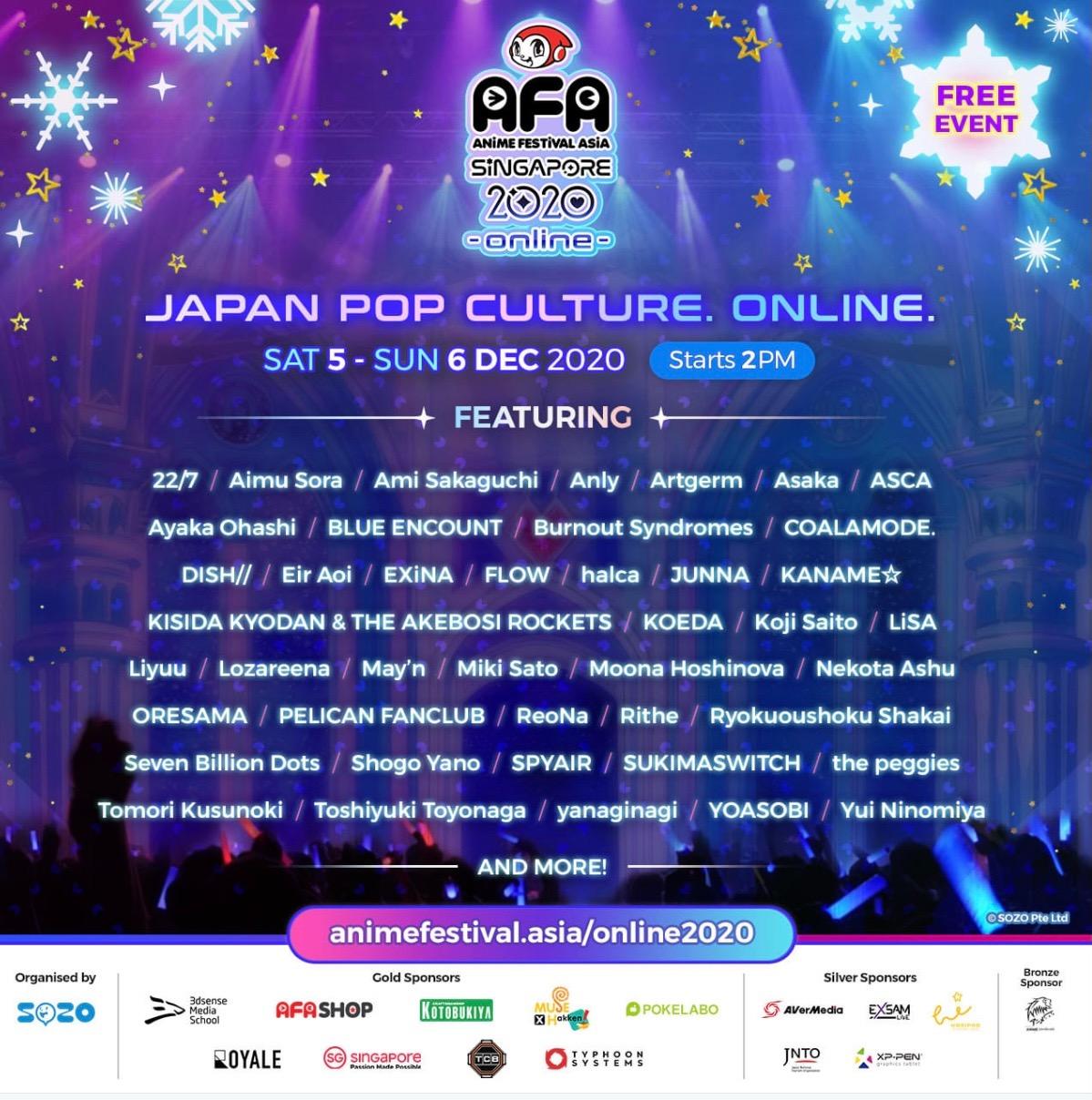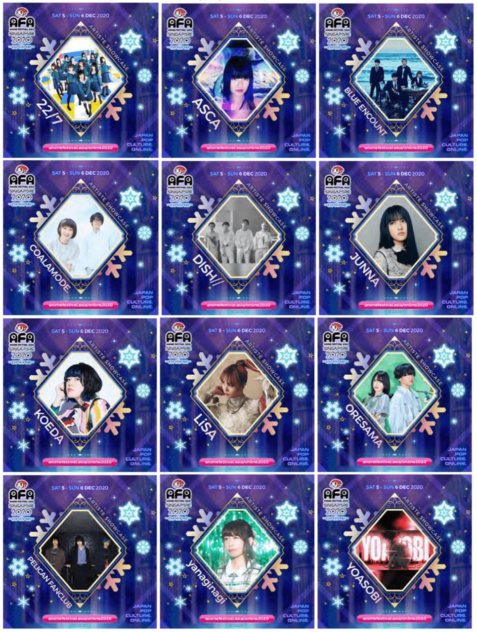 Dari deretan bintang tamu, event AFA Singapore 2020 Online akan menampilkan lebih dari 40 artis anisong terkemuka Jepang, mulai dari LiSA, May’n, Eir Aoi, FLOW, grup idola 22/7, YOASOBI, yanaginagi, hingga the peggies yang mengisi lagu tema anime Kanojo, Okarishimasu yang tayang pada musim panas 2020 lalu. Tak ketinggalan di acara ini ada juga virtual Youtuber dari Hololive ID, Moona Hoshinova.