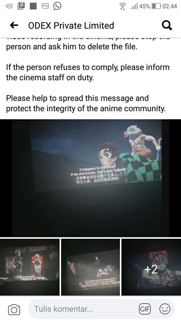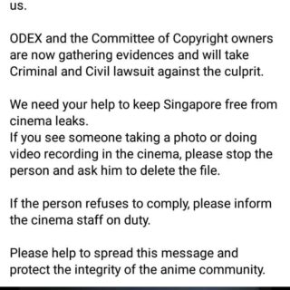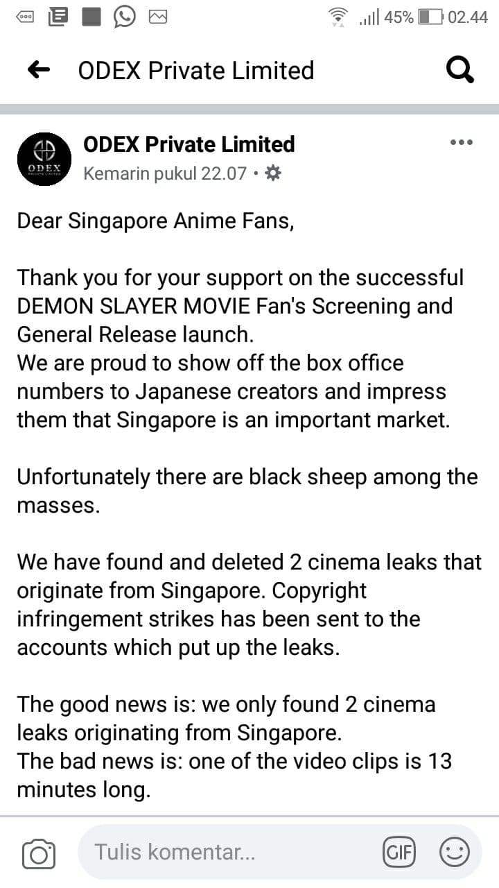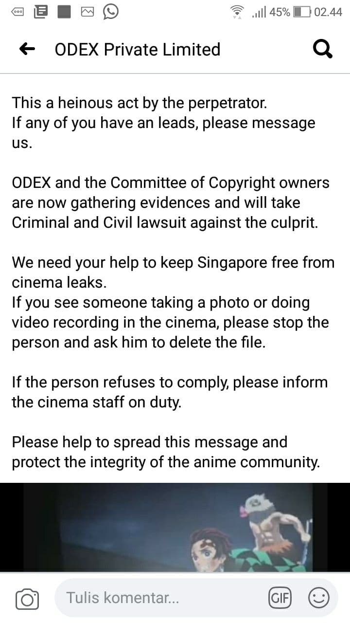 Kasus kebocoran film anime di bioskop kini kembali terjadi. Melalui akun Facebooknya, ODEX mengumumkan adanya kasus kebocoran di bioskop Singapura. Tak kurang dari 2 kasus kebocoran dan perekaman ilegal terhadap film layar lebar Demon Slayer: Kimetsu no Yaiba: Mugen Ressha-Hen (Mugen Train) terjadi di Singapura. Tak tanggung-tanggung, di antara rekaman tersebut ada yang berdurasi 13 menit.
