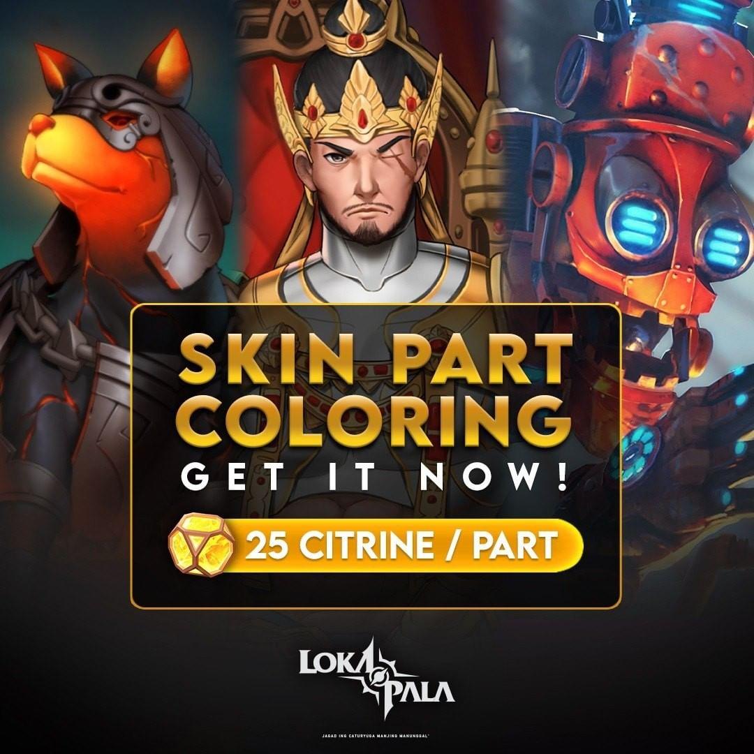 Salah satunya adalah skin part coloring untuk Ksatriya Sabara dengan nama skin Cerberus, Ksatriya Vijaya dengan nama skin Krtarajasa dan Ksatriya H’rtal dengan nama skin Smokestack Outburst. Skin part coloring tersebut bisa kamu dapatkan dengan menukarkan 25 Citrine/Part.