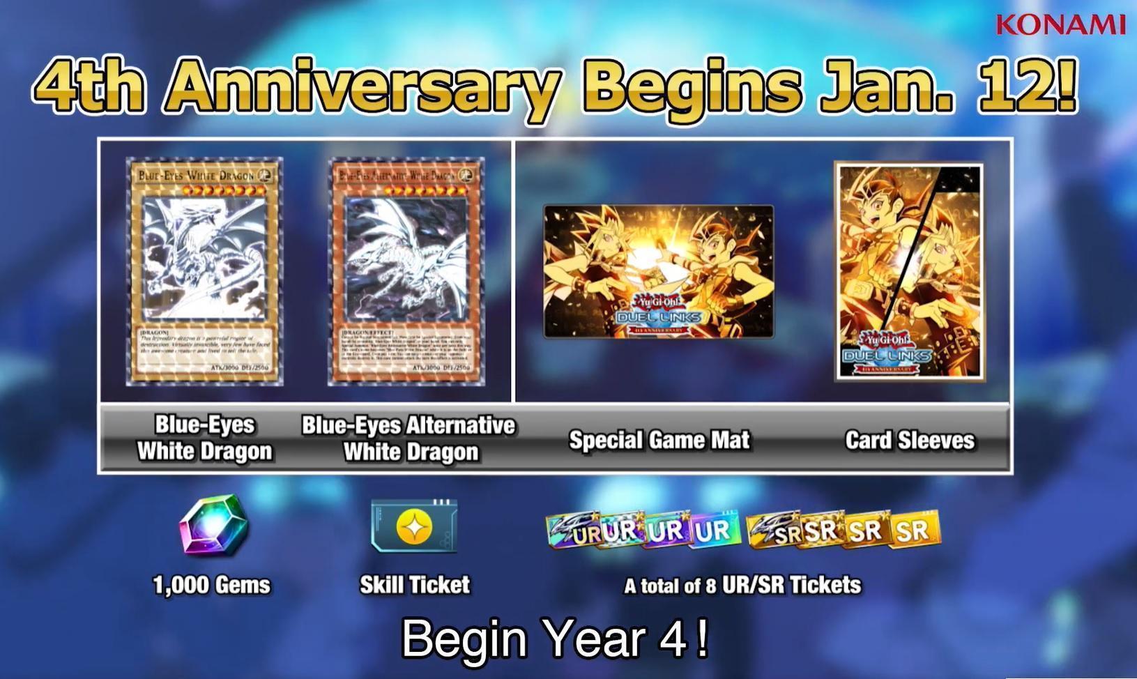 Konami Digital Entertainment Limited tengah merayakan hari jadi keempat Yu-Gi-Oh Duel Links! Biar kamu tetap ingat hari ini, KONAMI akan melancarkan tiga kampanye dalam-game berbeda dimulai dari hari ini.
