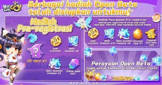 Pada saat open beta MoeGirl Go! dimulai, jumlah total pra-registrasi telah melebihi 1,2 juta. Jumlah pra-registrasi di situs resmi berhasil mencapai 500.000 dan semua hadiah pencapaian telah dibuka. Setiap pemanggil bisa mendapatkan Gold besar-besaran, Batu Summon II, Monster Egg dan Hero SSR.