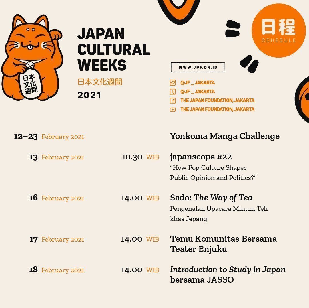 Berbeda dari tahun-tahun sebelumnya, seluruh rangkaian kegiatan Japan Cultural Weeks (JCW) tahun ini hadir dengan konsep daring yang akan diselenggarakan pada 12 – 27 Februari 2021 melalui beberapa platform media sosial milik the Japan Foundation, Jakarta. Beragam kegiatan yang diselenggarakan antara lain demonstrasi Ikebana, Chanoyu, talk tentang animasi, dan diskusi mengenai budaya kerja antara Indonesia dan Jepang.