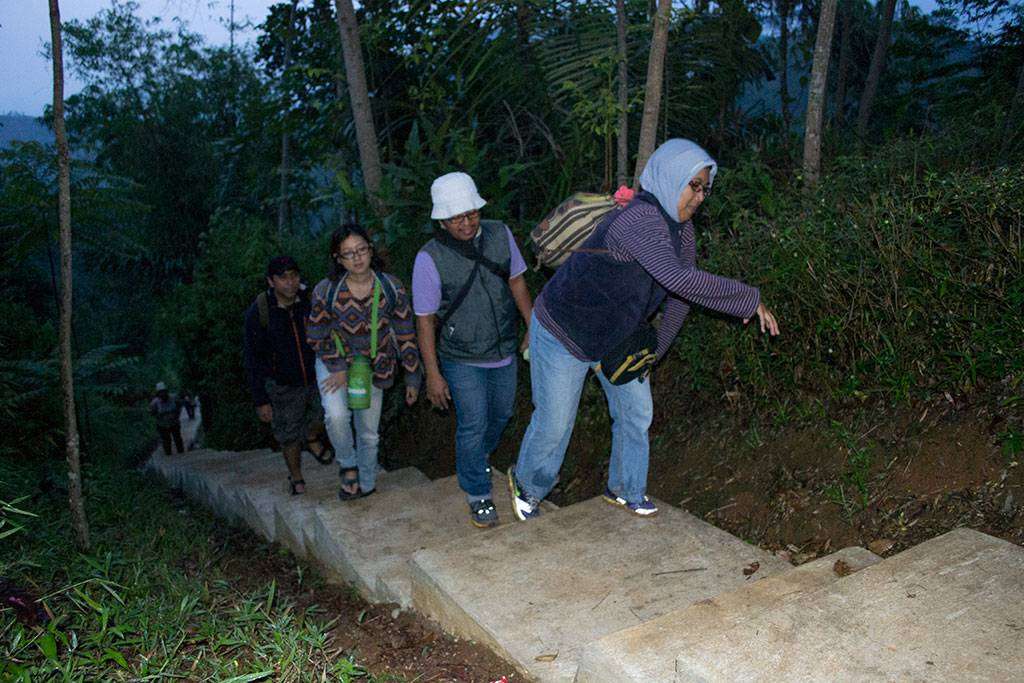 Tibalah saat menaiki “gunung”. Memang lebih mudah dari naik gunung, pun saya biasa jogging sekitar 500 meter setiap harinya. Tetap saja perasaan ini bergetar saat mendengar bisikan harus menapaki 700 anak tangga, curam-curam pula. Saya perkirakan kemiringannya pun sekitar 35 derajat, cukup terjal apalagi bagi banyak rekan lain yang sudah cukup berumur. Kondisi hujan juga membuat saya was-was, bakal terpeleset tidak ya karena jalan di sekitar pos masuk sebagian masih belum diaspal. Diperlukan waktu sekitar 25 menit bagi saya dan sekitar satu jam bagi ibu Lina yang notabene memang berbodi besar.