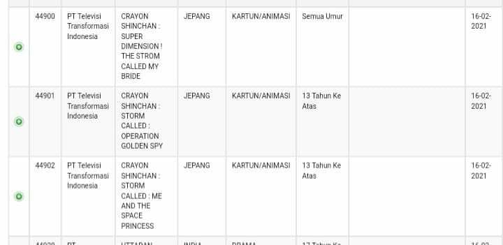 Stasiun televisi Trans TV akan menayangkan 3 judul film layar lebar dari anime Crayon Shinchan. ketiga film layar lebar tersebut adalah SUPER DIMENSION ! THE STROM CALLED MY BRIDE, STORM CALLED: OPERATION GOLDEN SPY, dan STORM CALLED : ME AND THE SPACE PRINCESS. Ketiga film layar lebar tersebut masing-masing adalah film-film yang dirilis di Jepang pada tahun 2010, 2011, dan 2012. Adapun untuk film SUPER DIMENSION ! THE STROM CALLED MY BRIDE sebelumnya pernah diputar di Indonesia dalam momen Jimpact 2013 di tahun 2013 lalu. Belum ada informasi lebih lanjut kapan kiranya ketiga film tersebut akan ditayangkan. Namun Trans TV telah dipastikan memiliki ketiga film tersebut melalui informasi yang terdapat dalam Lembaga Sensor Film (LSF).