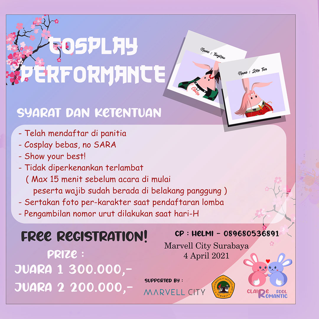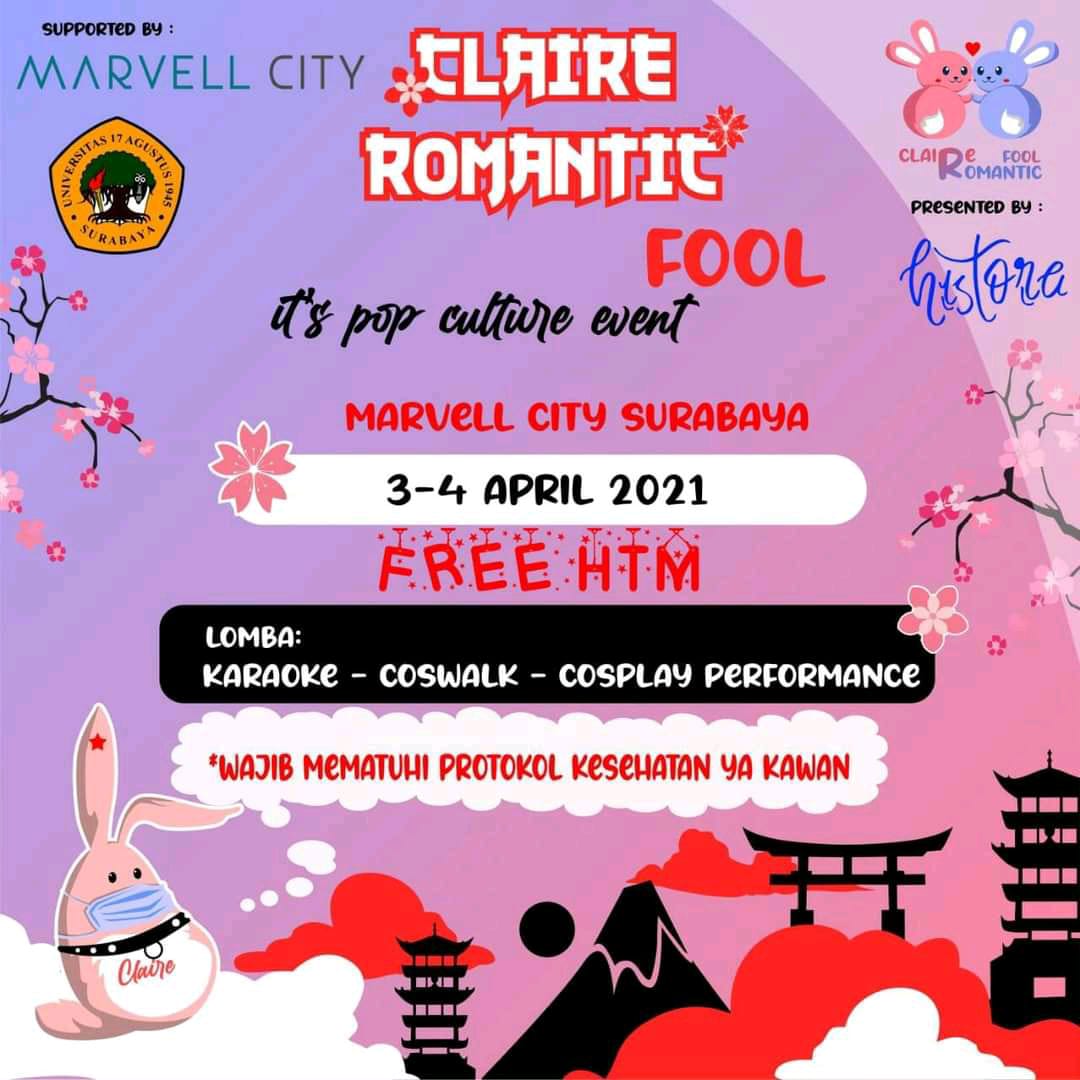 Claire Romantic Fool merupakan event jejepangan yang digelar oleh HIMAWARI Universitas 17 Agustus bersama-sama dengan Histora. Event ini akan diadakan secara offline di Marvell City Mall Surabaya berdekatan dengan peringatan hari “April Fool”. Selain itu di Claire Romantic Fool juga ada lomba cosplay, lomba coswalk, dan lomba karaoke yang pendaftarannya dilakukan melalui link https://bit.ly/CRF202104