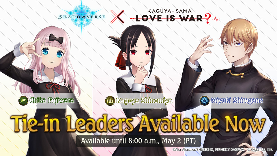 Leader yang disediakan cukup menarik, mulai dari Kaguya Shinomiya sebagai perwakilan Swordcraft, Miyuki Shirogane sebagai perwakilan Runecraft, dan Chika Fujiwara sebagai perwakilan Forestcraft. Pemain bisa membeli 1 paket Leader yang berisi Leader, Sleeve, Flair dan Emblem dengan. Pemain juga bisa membeli seluruh Leader tersebut dengan bundel berisi semua leader dari event kolaborasi ini lebih murah ditambah bonus Sleeve eksklusif dengan harga yang lebih murah dibanding membelinya satuan. Crystal (mata uang cash di Shadowverse) juga bisa dibeli dengan Gojek. Sebagai informasi tambahan, Leader dari Kaguya-sama: Love is War ini akan dijual secara terbatas sampai tanggal 2 May 2021.