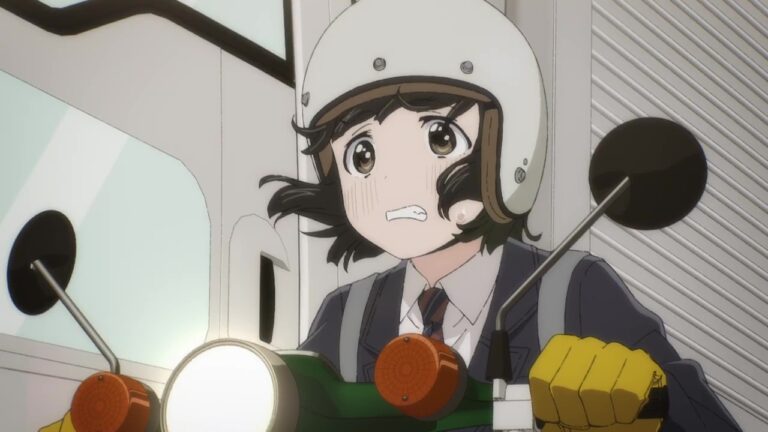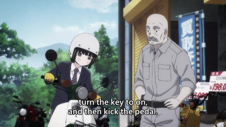 Bila Bakuon!! menghadirkan anime dengan bumbu komedi yang kadang-kadang terasa begitu gesrek, Super Cub hadir dengan nuansa yang lebih melankolis dengan pace cerita yang lebih lambat. Satu yang saya suka dari bagian ini adalah bagaimana anime ini memainkan penggunaan warna untuk memperkuat ceritanya. Di awal episodenya, kita diperkenalkan dengan Kogame yang memiliki keseharian yang terasa “membosankan”, namun semua berubah ketika akhirnya ia “berkenalan” dengan Honda S70 berkelir hijau. Tak lagi kelabu, sontak kehidupannya menjadi lebih berwarna, secara harfiah.