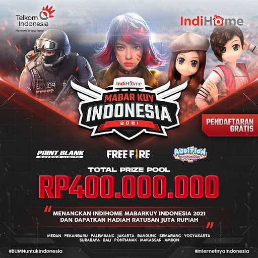 Total prize pool dari event IndiHome MabarKuy Indonesia 2021 senilai Rp400.000.000,- loh! Event ini terbuka untuk semua komunitas Free Fire, Point Blank dan AyoDance Indonesia. Tenang, tidak ada biaya pendaftaran alias GRATIS.