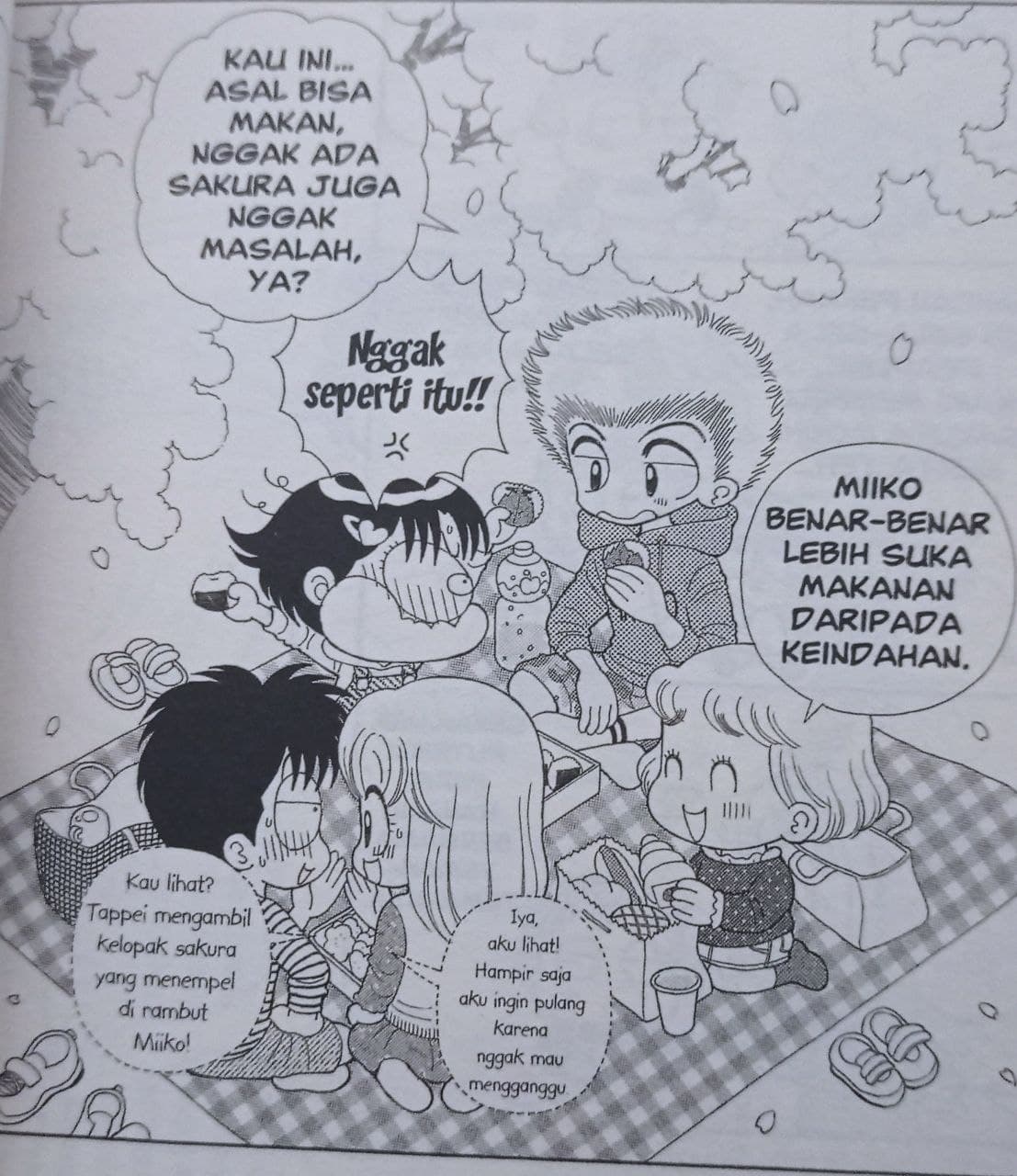 Ada lagi, Momo yang semakin besar, yang semakin lucu dan imut, hingga ingin punya adik seperti Momo. Rasanya dari sini yang paling berkembang adalah Momo sendiri, sedangkan karakter lainnya dengan perlahan mengalami perkembangan dengan lambat tetapi proses tersebut dapat dinikmati dengan santai, sehingga rasanya komik ini seperti kisah gadis bernama Miiko dari dirinya saat SD bahkan mungkin sampai pernikahannya nanti. Perkembangan karakter inilah yang sangat dinantikan karena rasanya seperti melihat anak sendiri tumbuh perlahan menjadi remaja, itu hal yang saya alami ketika membaca komik ini. Dalam komik ini dapat dilihat karakter Mari yang perlahan bisa menjaga pikirannya dengan dewasa, Yukko dan Kenta yang semakin mesra, Tappei yang perlahan ingin mengungkapkan perasaannya kepada Miiko, Yoshida yang sedang dilema karena perasaan dan masa depannya, dan lain-lain. Tentu didukung pula dengan terjemahan yang pas, ringan, dan santai ketika membaca komik ini. Yang akhirnya saya cukup merasa puas ketika membaca komik ini. Meskipun begitu saya terkadang merasa bosan di beberapa scene, karena merasa familiar dengan scene yang ada di komik sebelumnya. Karakternya itu-itu saja, terkadang merasa kurang drama. Tetapi kembali lagi berpikir bahwa Miiko ditunjukkan untuk shoujo alias gadis, dan itu tidak masalah.