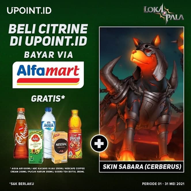 Para Ksatriya bisa dapatkan 1 buah minuman GRATIS dan BONUS Skin Sabara Cerberus, hanya dengan melakukan top up 259 Citrine Lokapala di UPoint.id melalui metode pembayaran di Alfamart.