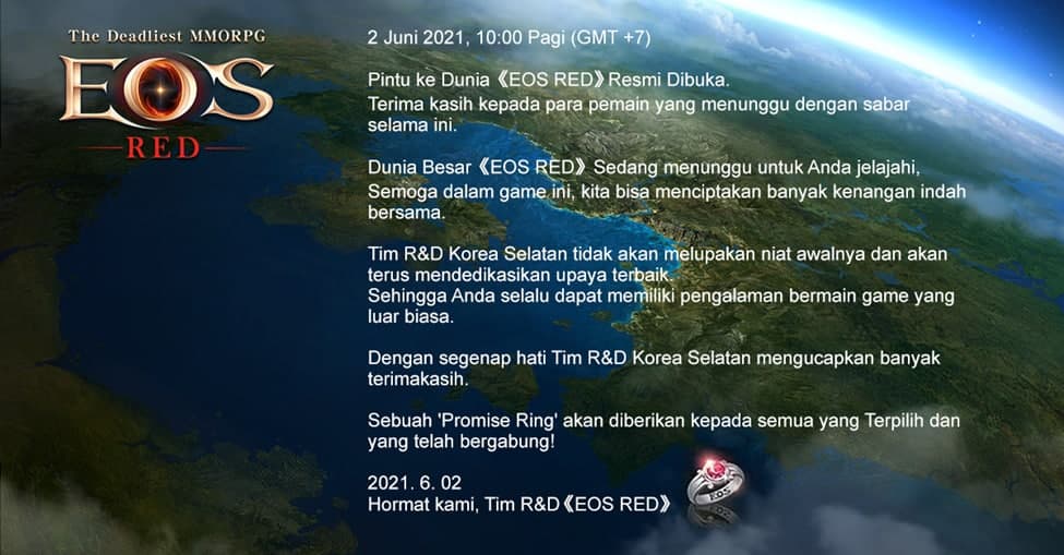 Pada tanggal 2 Juni 2021 pukul 10.00 (GMT+7) game MMORPG paling ‘berbahaya’ EOS RED resmi membuka servernya di Asia Teanggara (S.E.A). Dengan total 15 Negara termasuk Indonesia, EOS RED membuka servernya secara serentak!. Dengan adanya total sebanyak 1.9 juta pemain yang melakukan pre-registrasi, tim dari Korea Selatan Blue Potion Games mengucapkan banyak terima kasih atas dukungan dari semua pemain Asia Tenggara dan telah menyiapkan hadiah mysterius untuk para pemain! Banyak sekali fitur yang dapat kamu gunakan di MMORPG ini seperti sistem Pasar, Gallery, dan Guild. Buatlah tim bersama temanmu dan undanglah mereka untuk pertarung berbahaya bersama Guild.