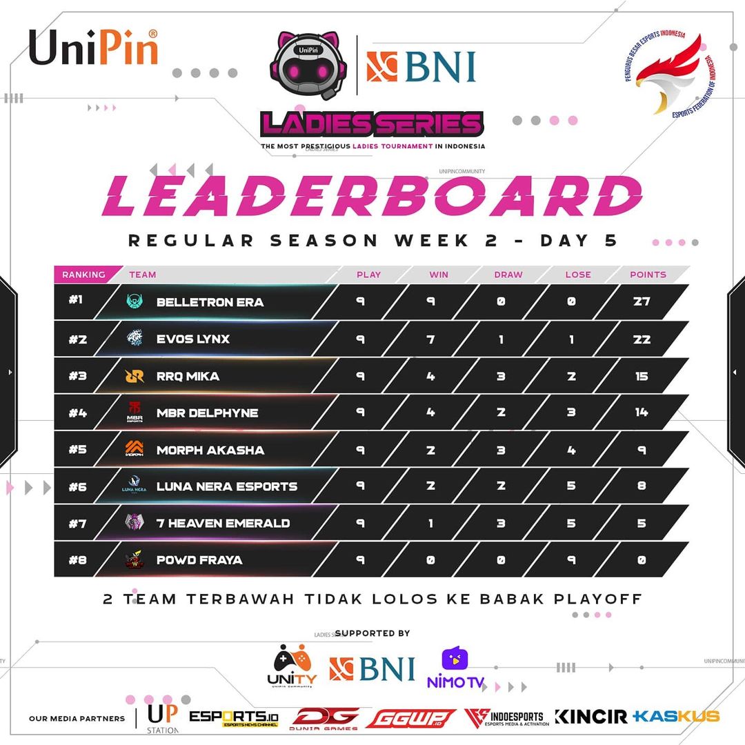 Meskipun begitu, posisi empat terbawah klasemen saat ini masih didominasi tim-tim dengan selisih poin yang kecil. Minggu ketiga regular season akan sekali lagi menjadi babak pembuktian enam tim yang layak masuk ke babak playoff. Babak playoff akan diselenggarakan secara online dan offline untuk kemudian menentukan jawara pertama Ladies Series MLBB 2021.