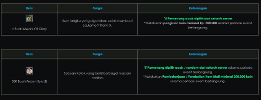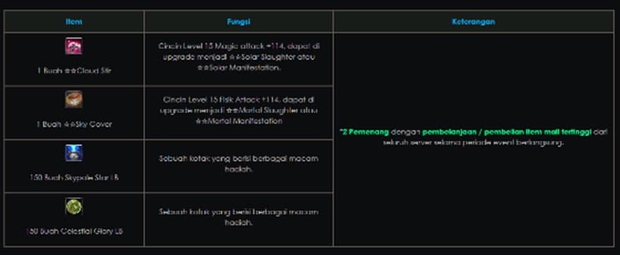 - Hadiah dibagikan kepada karakter yang melakukan pembelanjaan / pembelian item mall selama periode Event.