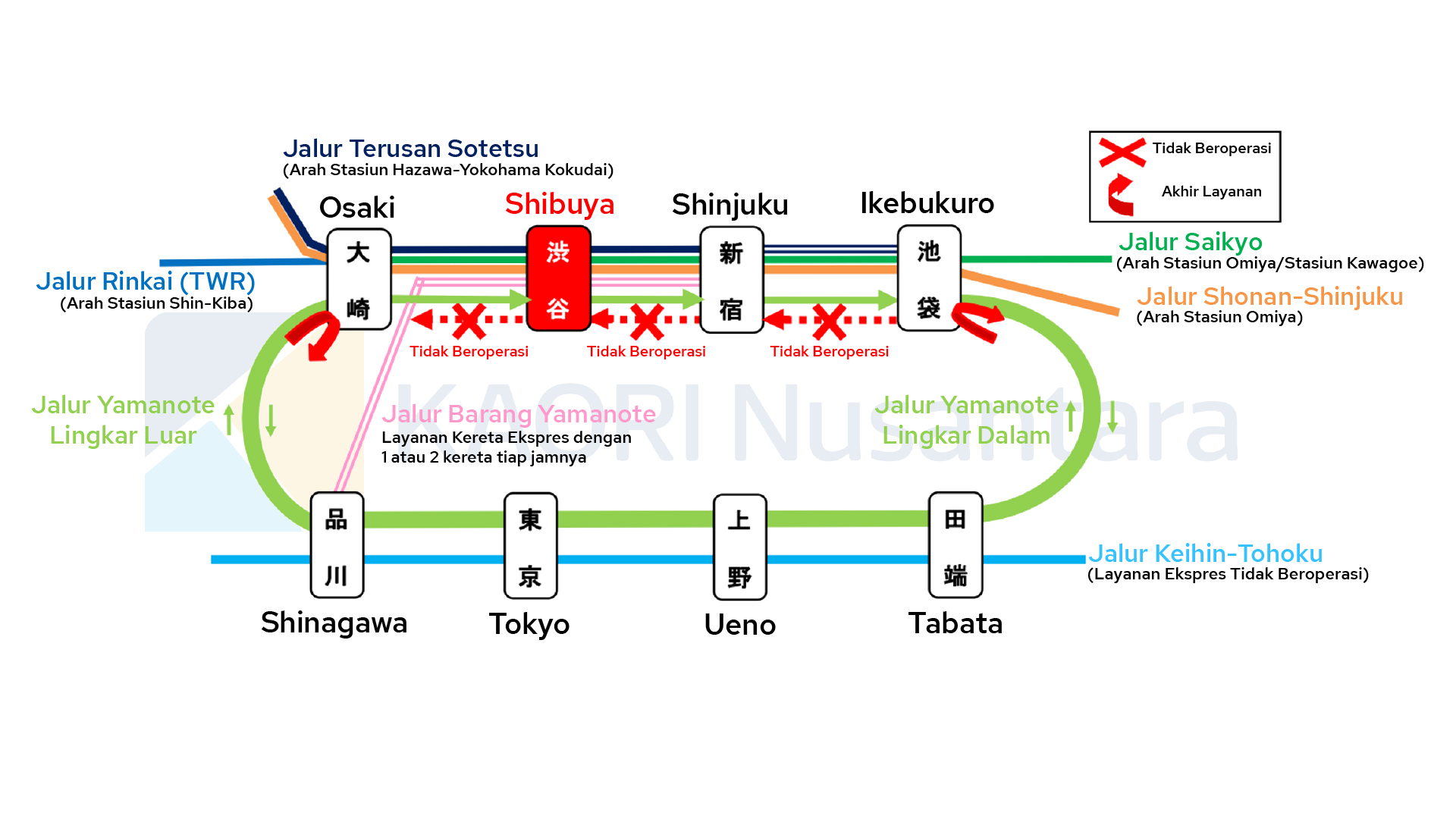 Selama perbaikan ini juga operasi jalur Yamanote tidak akan beroperasi di antara Stasiun Ikebukuro dan Stasiun Osaki. Untuk mengakomodir penumpang di antara kedua stasiun tersebut, JR East akan menambah perjalanan di jalur Saikyo-Rinkai, sedangkan jalur lainnya beroperasi seperti biasa kecuali jalur Keihin-Tohoku yang meniadakan layanan ekspresnya.