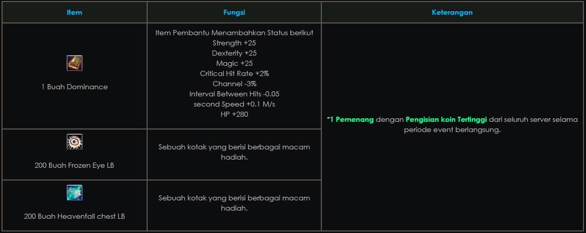 Selama periode event dari tanggal 26 Juli – 1 Agustus 2021, Tim Perfect World menyiapkan beberapa hadiah untuk player yang melakukan TopUp koin Tertinggi diseluruh server.