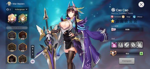 Yang terakhir ada Cao Cao, War Maiden yang paling langka ini memiliki senjata yang cukup unik, karena salah satu sisinya yang sangat besar dan juga tajam di tiap sisinya. Karakter ini memiliki skill aktif yang dapat memberikan ATK dan DEF squad sebesar 10% dengan Damage sebesar 10% selama 5 detik, bahkan dapat ditingkatkan sampai 20%.