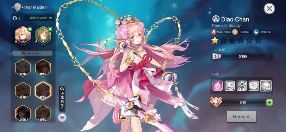 Kemudian ada Diao Chan war maiden yang paling langka dengan nuansa merah muda dan senjata tongkat yang dapat menjulur sangat panjang dengan terdapat pisau di ujungnya. Karakter war maiden ini juga memiliki tiga talent yang berbeda dari karakter-karakter sebelumnya.
