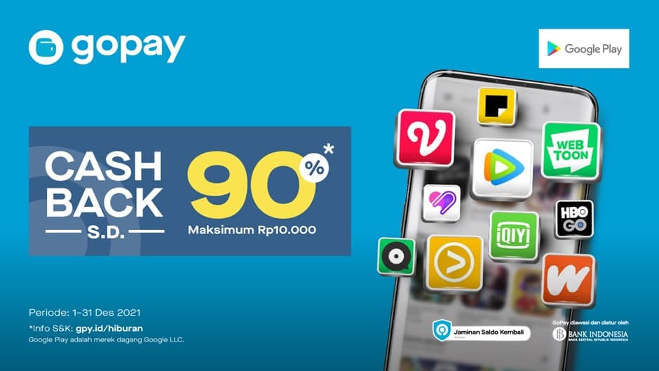 Eits tapi kamu bisa juga loh nonton VIP yang murah di WeTV, caranya yaitu dengan top up Google Play mu lalu gunakan metode pembayaran GoPay. Ada banyak promo games dan entertainment menarik yang bisa kamu dapatkan. Apa saja? Pertama, bagi pengguna baru, kamu bisa dapatkan cashback hingga 90% selama bulan Desember. Ada juga diskon hingga 40% untuk langganan WeTV VIP yang super murah, cuma Rp15.000 satu bulan.
