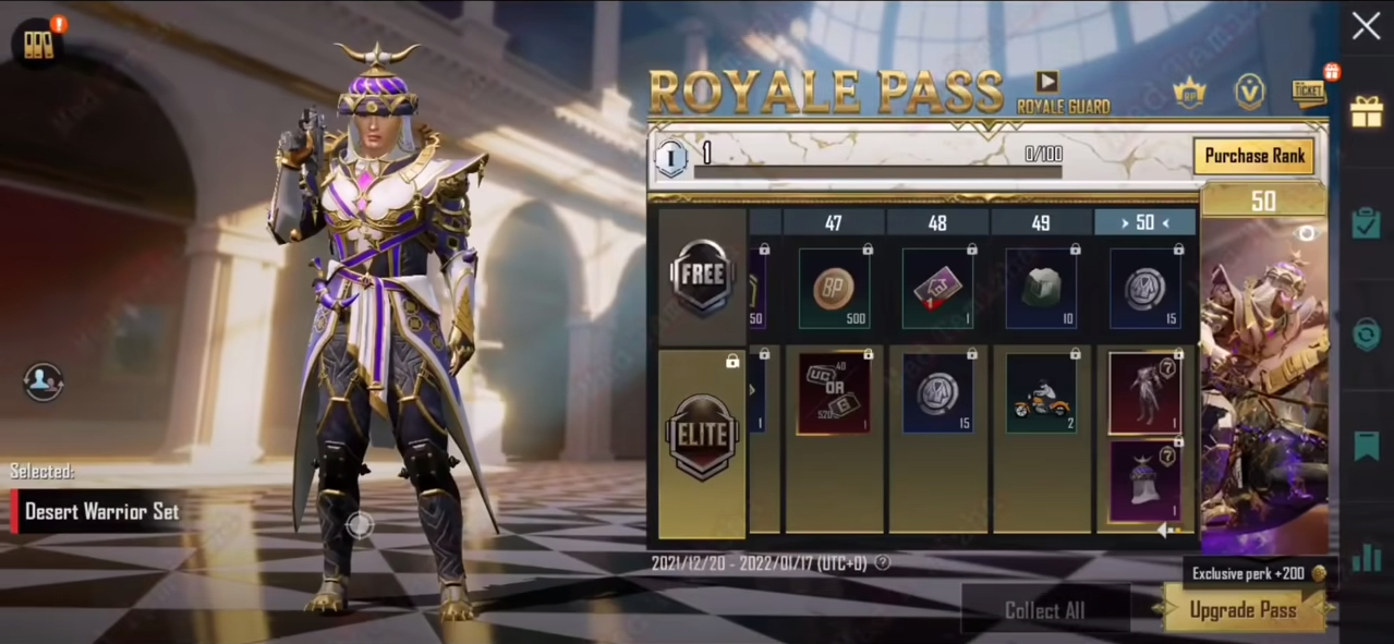 Upgrade Royale Pass-mu menjadi Elite Pass atau Elite Pass plus untuk mendapatkan berbagai hadiah eksklusif seperti skin M16A4, DP-28, UZI, 2-Seat Motorcycle, hingga set Desert Warrior!