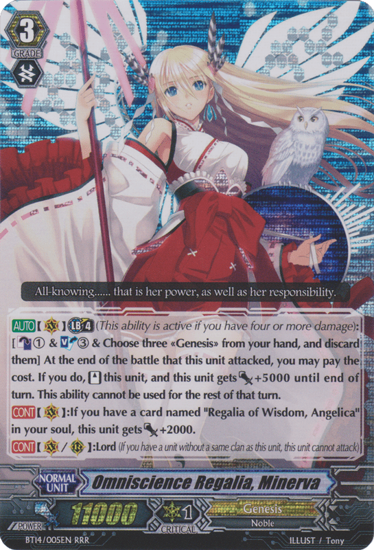 Omniscience Regalia, Minerva merupakan kartu dari klan Genesis yang muncul pada seri anime Cardfight!! Vanguard: Link Joker. Kartu ini sendiri dirilis dalam booster pack 14 – Brilliant Strikes. Cardfight!! Vanguard merupakan salah satu permainan kartu besutan Bushiroad yang tengah naik daun dikalangan penggemar permainan kartu saat ini. Permainan kartu ini sudah diadaptasi menjadi 5 musim seri anime, dengan Cardfight!! Vanguard G sebagai musim terbarunya yang kini sedang mengudara. Selain seri anime, permainan kartu ini juga sudah diadaptasi menjadi beberapa judul game untuk konsol Nintendo 3DS.