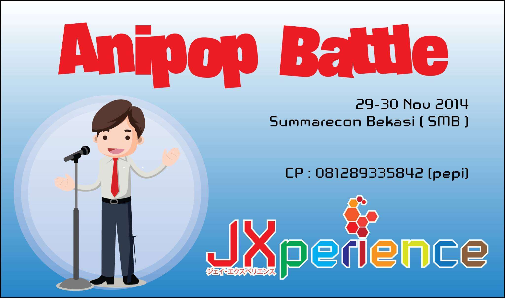Info lebih lanjut mengenai ANIPOP BATTLE bisa ditanyakan melalui sms ke 081289335842 ( pepi ) / 081807412212 (sas kwan) atau email ke [email protected] jangan lupa di cc ke : [email protected].