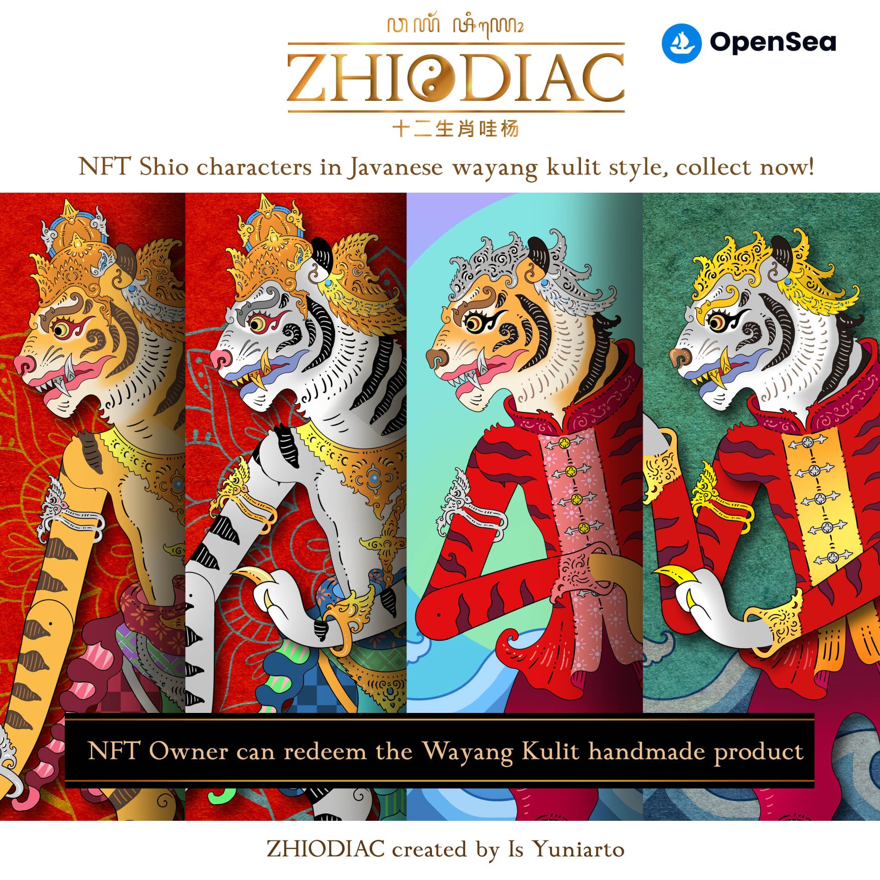 Is Yuniarto dan iNFT Project berkolaborasi dalam membuat projek NFT bernama ZHIODIAC, Projek ZHIODIAC adalah perpaduan Shio X Zodiac dalam bentuk visual wayang, yang bertujuan merayakan akulturasi budaya Nusantara dan Tionghoa, serta memperkenalkan tradisi kesenian wayang kepada generasi muda melalui medium modern. Konsep ZHIODIAC merupakan bagian dari ‘Wayangverse’ karya Is Yuniarto.