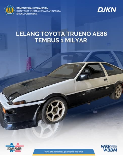 Kantor Pelayanan Kekayaan Negara dan Lelang (KPKNL) Pontianak berhasil melelang mobil Toyota Limited Edition Trueno AE86 yang merupakan salah satu mobil legendaris di ajang drifting internasional yang terjual Rp1,036 miliar dengan mekanisme e-auction open bidding melalui lelang.go.id pada Kamis (03/02).