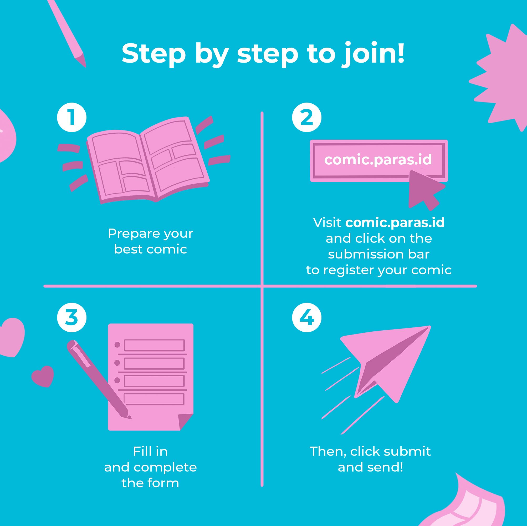 Adapun syarat dan ketentuan mengikuti Comic Festival – Valentine Edition Paras Comic adalah peserta diperbolehkan bekerja sendiri maupun dalam tim, membuat naskah komik digital dengan format webtoon, berwarna, original, berbahasa Inggris ataupun Indonesia, dan menghindari tema yang berbau seks, politik, SARA, kekerasan, diskriminasi, dan isu-isu sensitif. Pastikan karyamu belum pernah terbit atau dikirim ke website atau lomba lain.