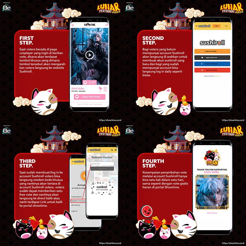 Jumlah voting LOVE kalian akan menentukan siapa cosplayer terfavorit di Showtime Lunar Festival 2022. Selain tiga pemenang hasil voting event, ada dua pemenang lainnya dari pilihan favorit dari IndoCosuGram (ICG) dan Sushiroll.