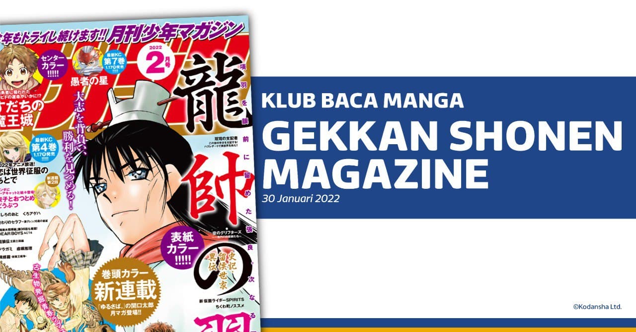 Majalah yang terpilih untuk sesi Klub Baca Manga di bulan Januari 2022 adalah majalah shonen, Gekkan Shonen Magazine yang diterbitkan oleh Kodansha. Majalah ini awalnya terbit di tahun 1964 dengan nama Bessatsu Shonen Magazine, sementara nama yang sekarang digunakan sejak 1975 (nama Bessatsu Shonen Magazine sendiri kini digunakan oleh majalah yang berbeda yang juga diterbitkan Kodansha). Beberapa judul populer di majalah ini yang pernah terbit di Indonesia termasuk Tekken Chinmi (Kung Fu Boy), BECK, Noragami, Dear Boys, C.M.B., dan Your Lie in April.