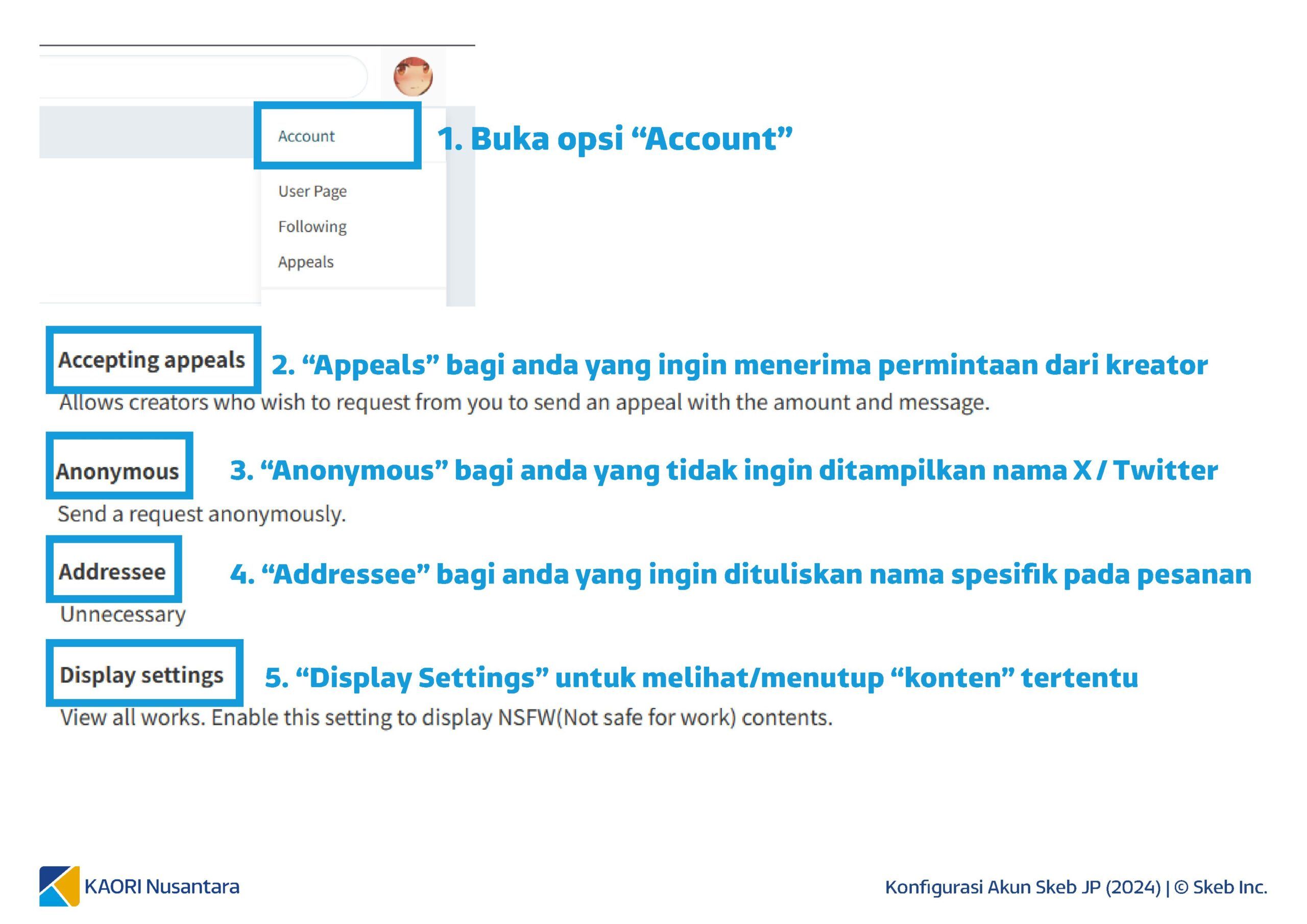 - Anonymous, setiap hasil permintaan yang kalian buat akan terpampang dalam profil akun Skeb kalian. Jika kalian tidak ingin hal itu maupun ataupun nama X / Twitter kalian terpampang, kalian dapat membuat akun menjadi anonim.