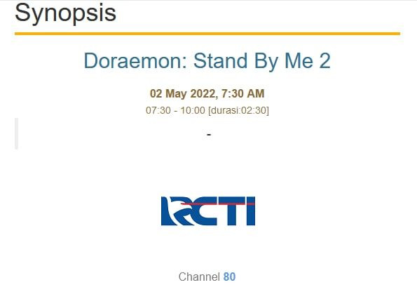 Stand By Me Doraemon merupakan film 3D yang mengisahkan kembali sejumlah momen-momen spesial dari kisah persahabatan Doraemon dan Nobita. Film pertamanya dirilis pada tahun 2014 lalu dan juga telah ditayangkan di Indonesia. Adapun film keduanya dirilis pada tahun 2020, dan juga telah dirilis di Indonesia, baik itu di bioskop maupun sejumlah layanan streaming. Kini akhirnya Stand By Me Doraemon 2 juga siap ditayangkan di stasiun televisi RCTI yang merupakan stasiun televisi yang sudah sejak lama memutar anime Doraemon.