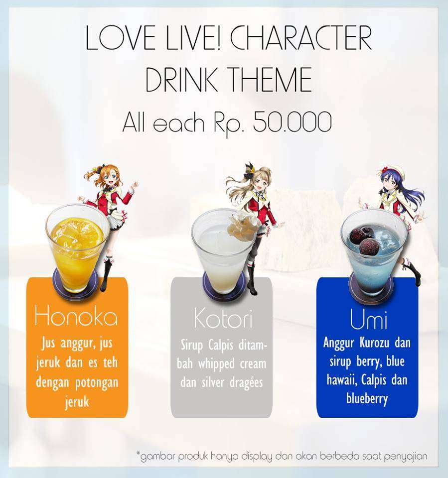 Selain informasi mengenai reservasi tempat, pihak STARMUSE baru saja mengumumkan menu makanan dan minuman yang dapat dipesan di maid cafe ini. Menariknya, berbagai menu yang ada di maid cafe ini bercirikan masing-masing karakter yang tergabung dalam grup idol u’s dalam seri Love Live! Berikut adalah menu maid cafe Love Live! STARMUSE Idol Project: