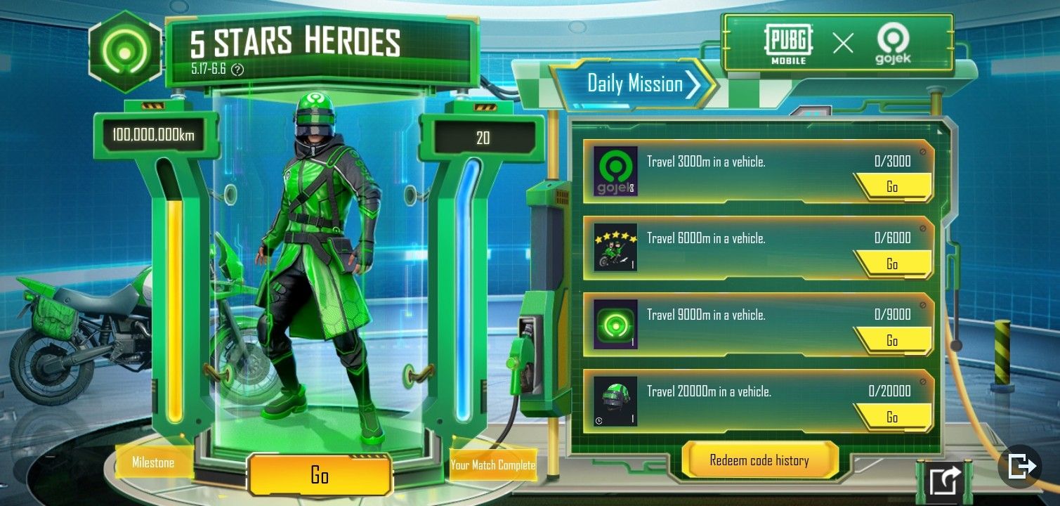 Bagi para survivor yang merupakan kaum gratisan, PUBG Mobile juga hadirkan event spesial dengan nama PUBG Mobile x Gojek : Pahlawan Bintang Lima. Di dalam event tersebut pemain harus mengumpulkan milestone perjalanan dengan menggunakan kendaraan apapun untuk mendapatkan Sticker Like Gojek, Grafitti logo Gojek, sampai Skin Helm Gojek.
