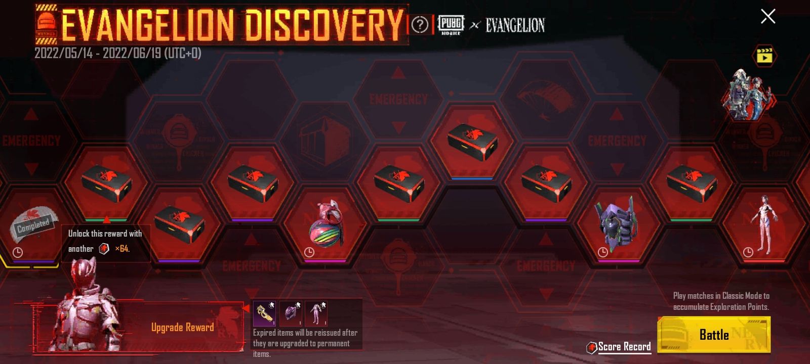 Pemain juga bisa mendapatkan NERV Medal dengan menyelesaikan permainan di classic mode maupun di mode spesial Core Circle Mode di Evangelion Explore. Kumpulkan dan dapatkan item-item eksklusif dari event kolaborasi PUBG Mobile x Evangelion secara gratis. Adapun item tersebut terdiri dari Skin P90 – EVA Unit 00, helm Kolaborasi PUBG Mobile x Evangelion, NERV Parachute, sampai satu set Pluguit Mari Makinami dan Pan bertemakan 10th Angel. Akan tetapi, beberapa item kolaborasi tersebut mempunyai batas waktu. Jika pemain ingin mendapatkan item kolaborasi tersebut secara permanen, pemain bisa melakukan prize upgrade yang ditawarkan di kolom event dengan harga mulai dari 300 UC. Pemain bisa mendapatkan 3 item awal yang bisa didapatkan secara permanen.