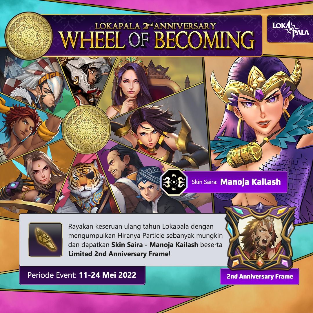 Sebagai apresiasi dan juga merayakan hal tersebut, Anantarupa Studios membuat event Lokapala 2nd Anniversary (Wheel of Becoming) – Limited Event yang berlangsung dari tanggal 11 – 24 Mei 2022. Pemain Lokapala atau Ksatriya dapat berpartisipasi dengan mengumpulkan Hiranya Particle sebanyak mungkin agar berkesempatan untuk mendapatkan Skin Ksatriya Saira – Manoja Kailash dan Limited Lokapala 2nd Anniversary Frame.
