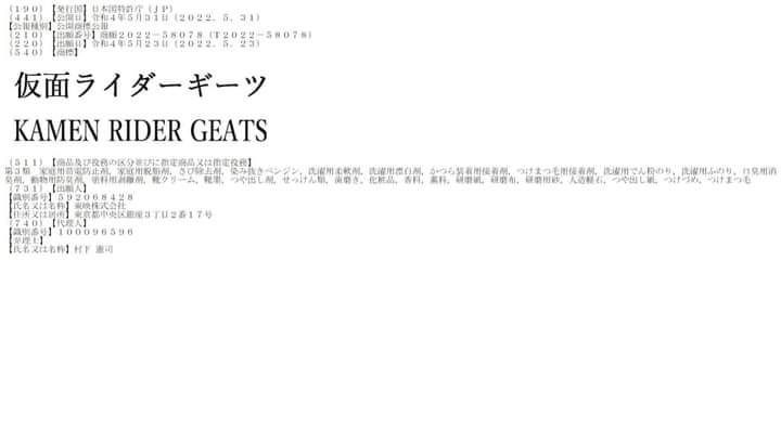 東映株式会社により「仮面ライダーギーツ / KAMEN RIDER GEATS」が商標登録出願されていることが、公開商標公報から明らかになりました。