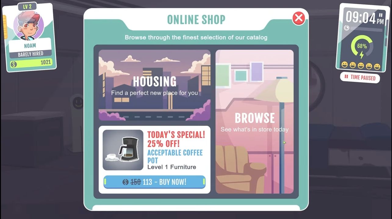 Setelah tugas selesai, maka akan ada hasil yang bisa dijadikan uang untuk pemain kumpulkan sedikit demi sedikit. Uang tersebut bisa dipakai untuk upgrade apartemen, membeli furnitur di shop atau untuk keperluan transportasi seperti menyewa sepeda, naik bis atau transportasi yang disediakan.