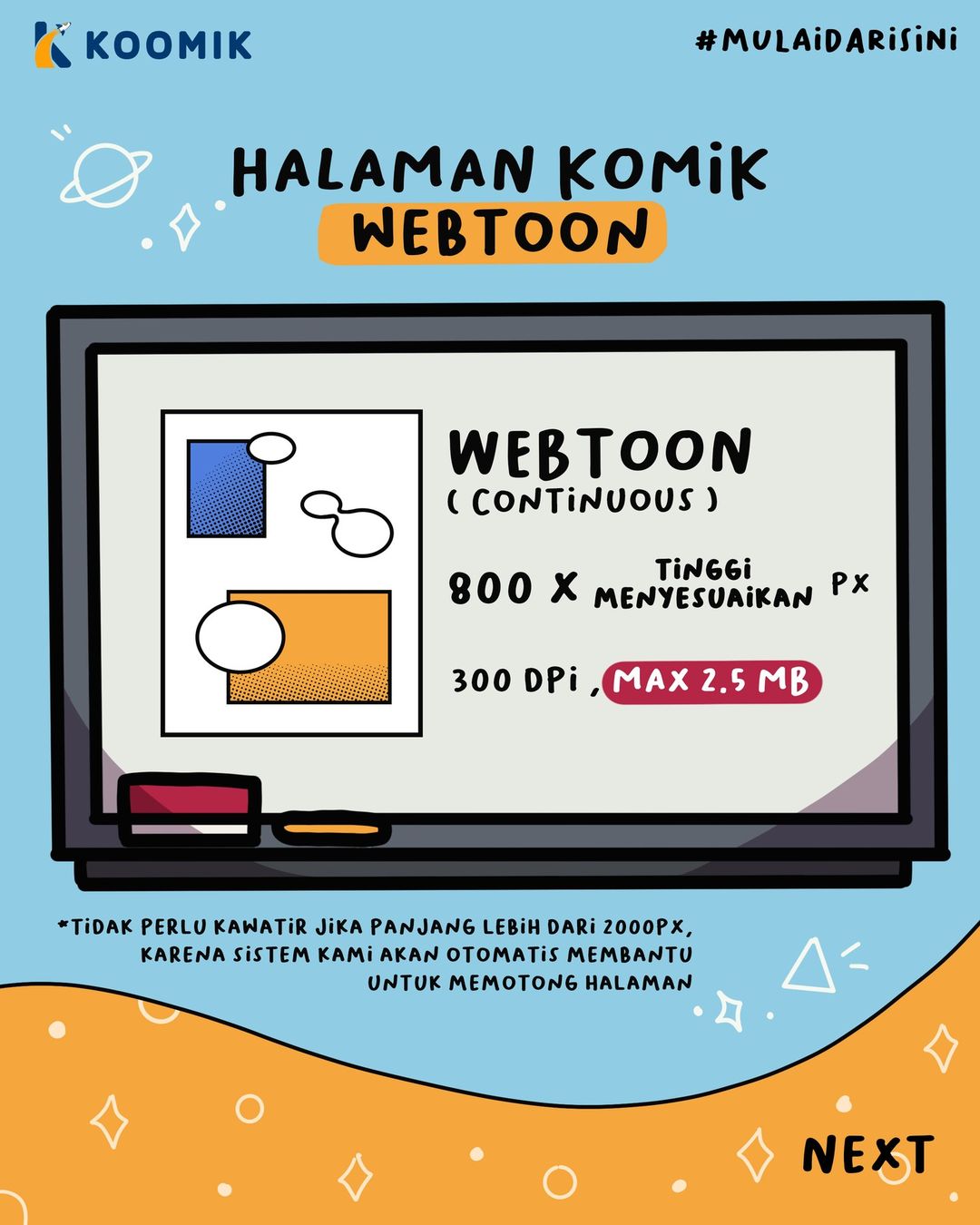 Untuk mengikuti kompetisi kategori Webtoon peserta bisa mengupload komik melalui halaman cms.koomik.id. Setelah berhasil log-in,peserta harus memilih jenis komik Continues dan genre Mafi-VI. Ukuran gambar halaman komik yang bisa diunggah memiliki ukuran wide 800 pixel dengan resolusi 300dpi dan maksimal file size 2.5 MB. Untuk ukuran tinggi halaman peserta bisa membuat menyesuaikan dengan panjang Webtoon yang dibuat, nantinya di sistem Koomik file yang telah diunggah akan otomatis membantu memotong halaman jika tinggi halaman melebihi 2000 pixel.