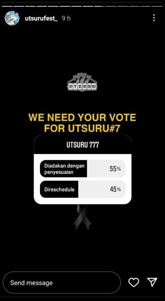 Acara Utsuru 777 yang akan dilaksanakan pada hari Minggu (9/10) besok resmi dilanjutkan. Melalui unggahan di media sosial mereka, pihak panitia Japan Culture Daisuki menyatakan acara akan tetap diadakan dengan format yang disesuaikan dengan suasana berkabung di wilayah Malang.