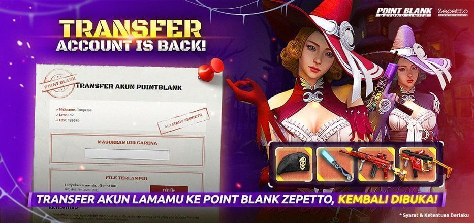 Point Blank kembali menghadirkan event transfer account dari akun PB Garena ke PB Zepetto. Pemain yang ingin mentransfer akun lamanya hanya perlu menunjukkan bukti kepemilikan ID lama (ID PB Garena) yang nantinya akan dicek oleh tim Point Blank. Event transfer akun ini dibuka mulai 11 Oktober 2022 hingga tanggal 7 November 2022 mendatang.