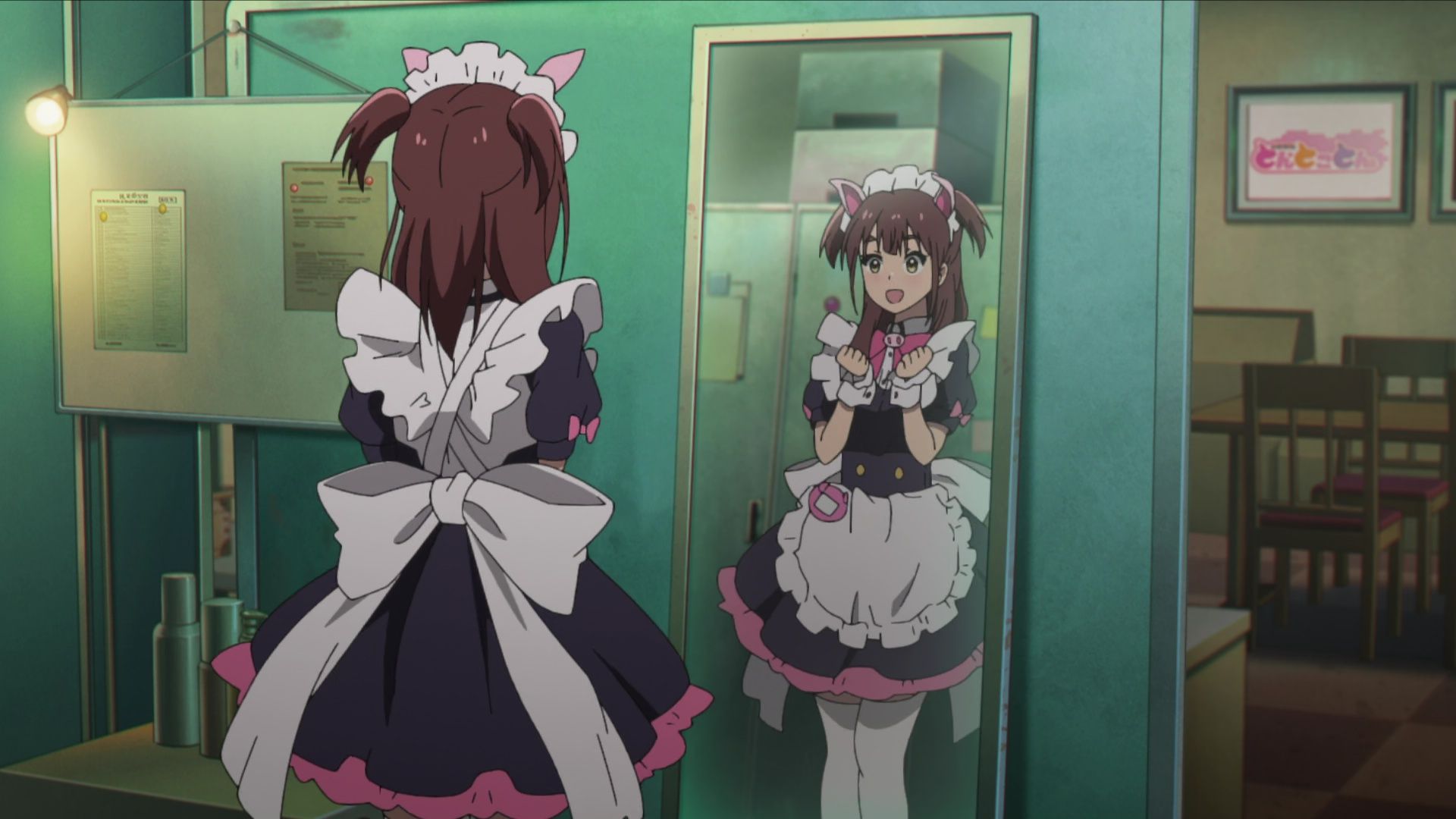 Jadi seperti apa animenya? Terlepas dari adegan intro-nya, paruh awal episode perdana Akiba Maid Sensou memang terasa seperti anime komedi slice-of-life pada umumnya, tentu dengan nuansa maid cafe. Sumber komedinya muncul dari karakter Nagomi yang kikuk karena baru bekerja menjadi maid dan Ranko yang terlalu “kaku” ketika menjadi maid. Semuanya langsung berubah di paruh kedua episodenya. Pertanyaan seputar mengapa adegan intronya terasa seperti anime bertema “kriminal” akhirnya terjawab dengan cerita yang berbelok 180 derajat. Highlight-nya tentu berasal dari adegan “dar-der-dor” yang tentu saja berdarah-darah dan over the top. Adegan membantai maid dari cafe sebelah pun juga semakin lucu karena juga menggunakan gerakan wotagei yang dianimasikan dengan begitu apik oleh P.A. Works.