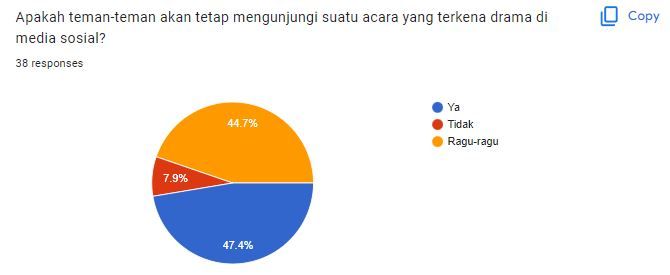 Setelah mengetahui ada drama di suatu acara, apakah mereka akan tetap datang? Ternyata hanya 3 orang (7,9%) yang secara tegas menyatakan tidak akan datang. 18 orang (47,4%) dari responden mengatakan mereka akan tetap datang, sementara 17 orang (44,7%) mengatakan mereka menjadi ragu-ragu untuk datang.