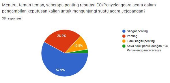 Ketika membicarakan drama, peran penyelenggara (EO) biasanya tidak bisa dipisahkan dari hal ini. Ketika ditanyai soal seberapa penting reputasi EO bagi pengunjung, 22 orang (57,9%) mengatakan reputasi EO sangat penting dalam pengambilan keputusan mereka untuk datang ke acara jejepangan. 11 orang (28,9%) menyatakan reputasi EO penting bagi mereka. 4 orang (10,5%) menyatakan reputasi EO tidak begitu penting, sedangkan 1 orang (2,6%) menyatakan mereka tidak peduli dengan reputasi EO.