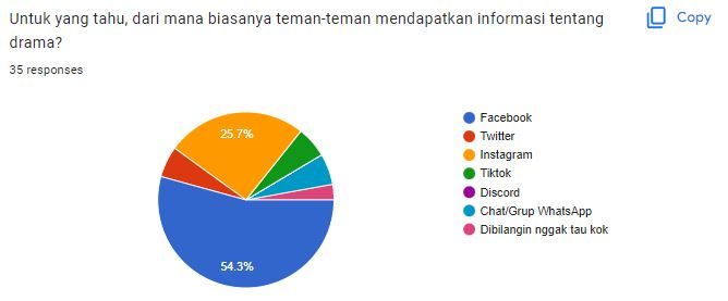 Hal menarik lain yang kami temukan adalah soal media sosial tempat mereka mendapatkan informasi drama. Lebih dari setengah responden yang mengetahui drama medsos menjawab mereka mengetahui drama medsos melalui Facebook dengan 19 orang (54,3%). 9 orang (25,7%) menjawab mereka mengetahui drama melalui Instagram. Tiktok, Twitter, dan chatgrup WA mendapatkan masing masing 2 suara (5,7%). Hal ini menarik karena seperti yang sudah kami sampaikan di bagian demografi, Facebook bukanlah media sosial yang paling banyak dipakai. Namun Facebook justru menempati tempat teratas untuk sumber informasi drama.