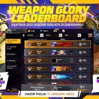 - Weapon Glory Leaderboard : Sistem leaderboard yang mengajak Survivors untuk menjadi yang terbaik dalam menggunakan berbagai Weapons di Free Fire. Pemain yang masuk Top 100 dalam setiap Weapons akan mendapatkan Title khusus untuk menunjukkan peringkat mereka di skala Regional (Provinsi) dan Nasional. Mode Clash Squad dan Battle Royale akan memiliki leaderboard terpisah.